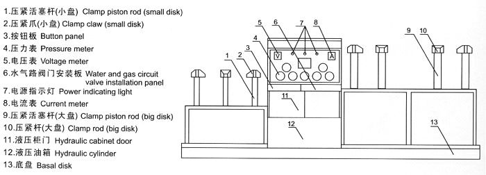 (4)點動夾緊爪,夾緊被測蝶閥(法蘭或平面);(5)按增壓扭至所需壓力(夾緊油缸所需壓力對照表)(貼在機上)。增壓按鈕可多次點動,每次間隔若三秒鐘左右, (指第一次按下未達(dá)到所需壓力時)。最高壓力32MPa;(6)進(jìn)行水壓或氣壓對被試蝶閥進(jìn)行測試;(7)測試完 畢后,打開放水或氣開關(guān),泄掉壓力即可; (8)先后按各放松鈕,將被測閥門取下。
